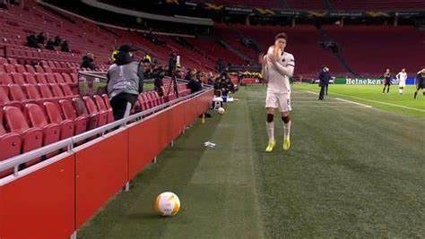 4月9日,罗马球员卡拉菲奥里在阿贾克斯客场被球砸的镜头,和格拉纳达裸奔男一起,占据了欧洲各大媒体体育头条。这是一个很罕见的场景,卡拉菲奥里被当场出示黄牌,欧足联也有可能就这一事件对阿贾克斯的主场提出警告。(