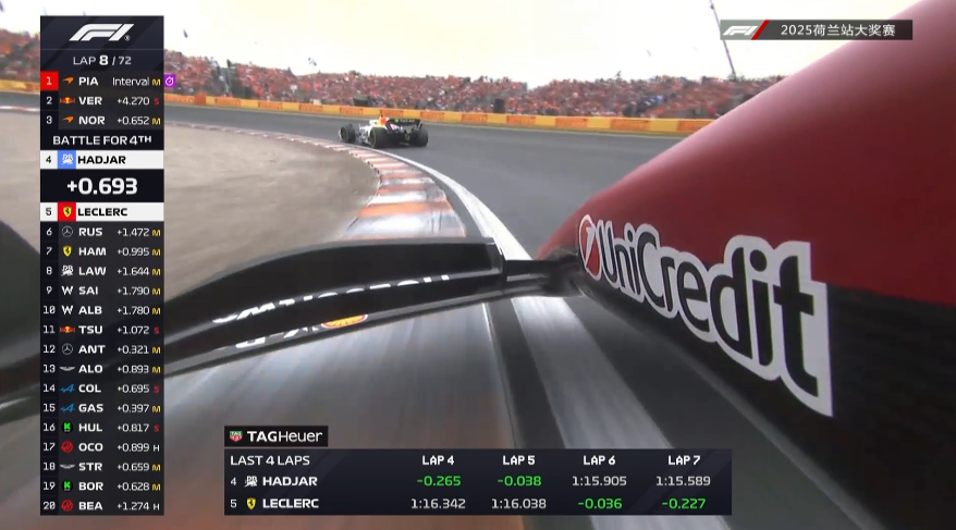 比赛来到第4圈,哈贾尔依旧守住自己第四的位置,身后的勒克莱尔早已进入DRS区但很难真正完成超越。来到第7圈,勒克莱尔已经将差距追到了0.7秒左右。