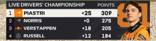 随后的比赛没有了任何悬念!最终皮亚斯特里实现Pole To Win,并且在积分榜上进一步拉开了和身后诺里斯的差距,又是达到了34分!