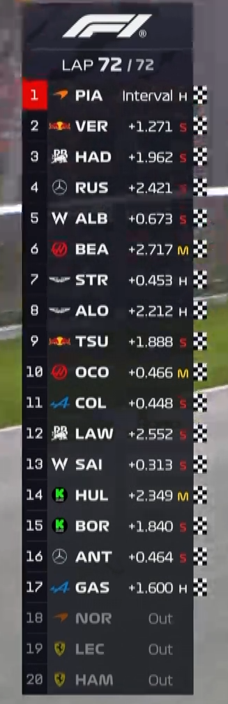 随后的比赛,领先的皮亚斯特里进入到了巡航模式,身后的诺里斯始终未能进入队友的DRS区。车阵后方,两辆没有进站的哈斯分列第10和第11名,由奥康领衔的“DRS高铁”让后方的赛车跑得越来越挣扎。
